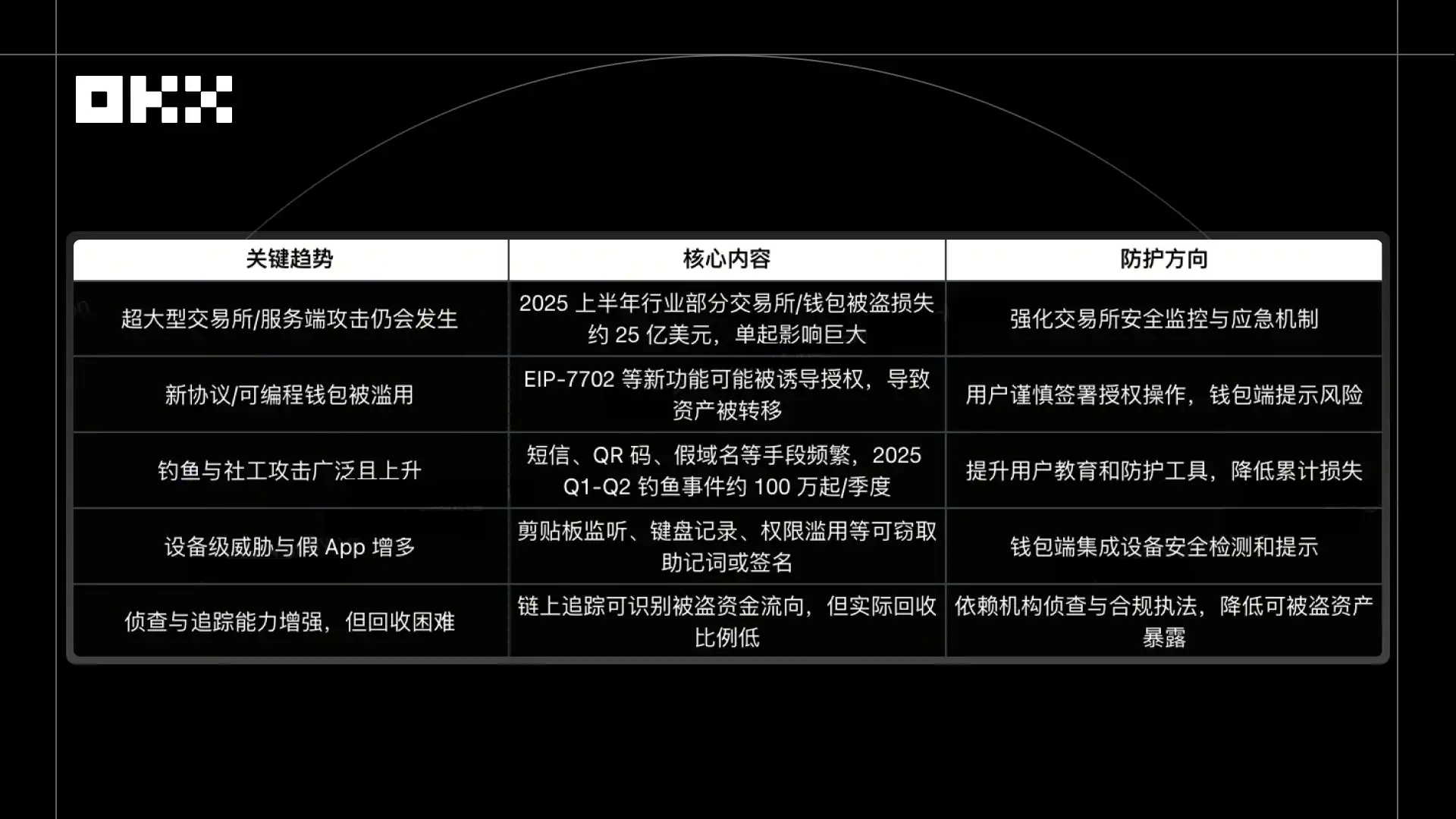 從 2024 年到 2025 年,行業安全態勢表現為兩種並行:少數大型交易平台或服務端被攻破,造成高額損失;同時,個人端也不斷遭遇釣魚、惡意軟件和社會工程詐騙,帶來頻繁的小額損失。高額集中損失(平台)和高頻小額損失(用戶)同時存在,使整個行業安全雙重承壓。